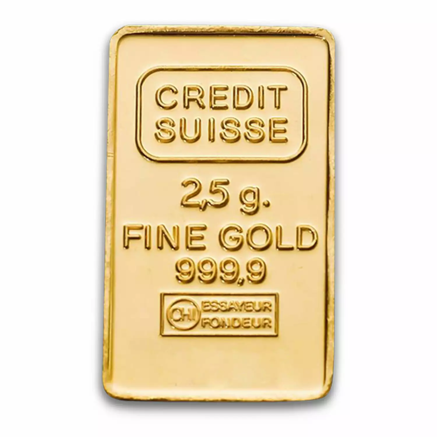 The 2.5g Credit Suisse Gold Bullion Bar contains 2.5 grams of .9999 fine gold. The Reverse of the gold bar depicts the Credit Suisse logo repeated in a diagonal pattern.