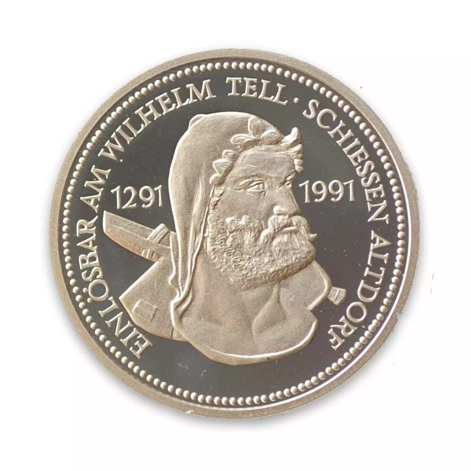 The Swiss Platinum Shooting Thaler commemorates one of the Schützenfest or free shooting tournaments held in various Swiss cantons.