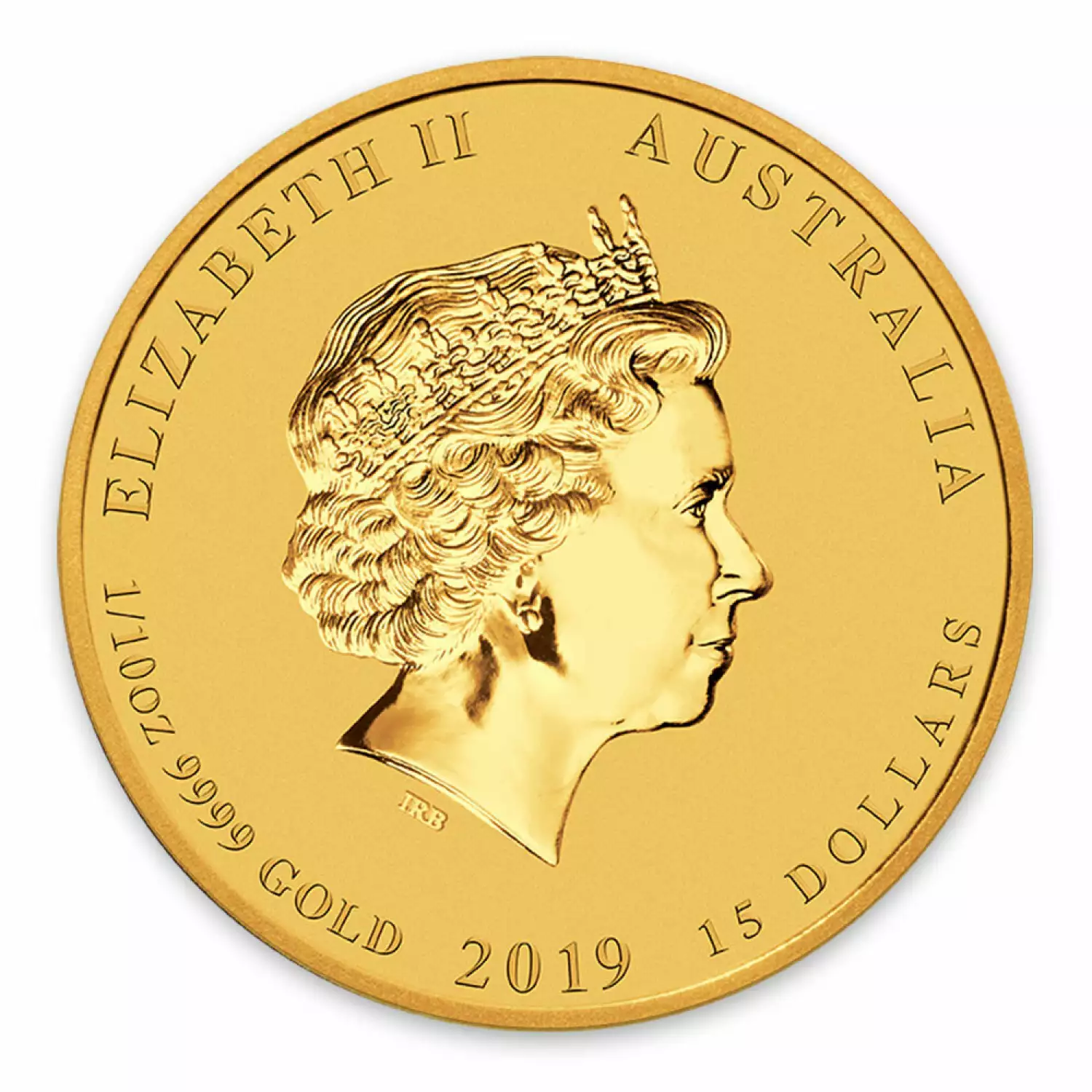 The 2019 1/10 oz Australian Perth Mint Gold Lunar: Year of the Pig is the final release of the Lunar Series I 12-Coin series and has a low mintage of only 7,694 coins. This bullion coin is composed of 1/10 Troy ounce of .9999 fine gold.