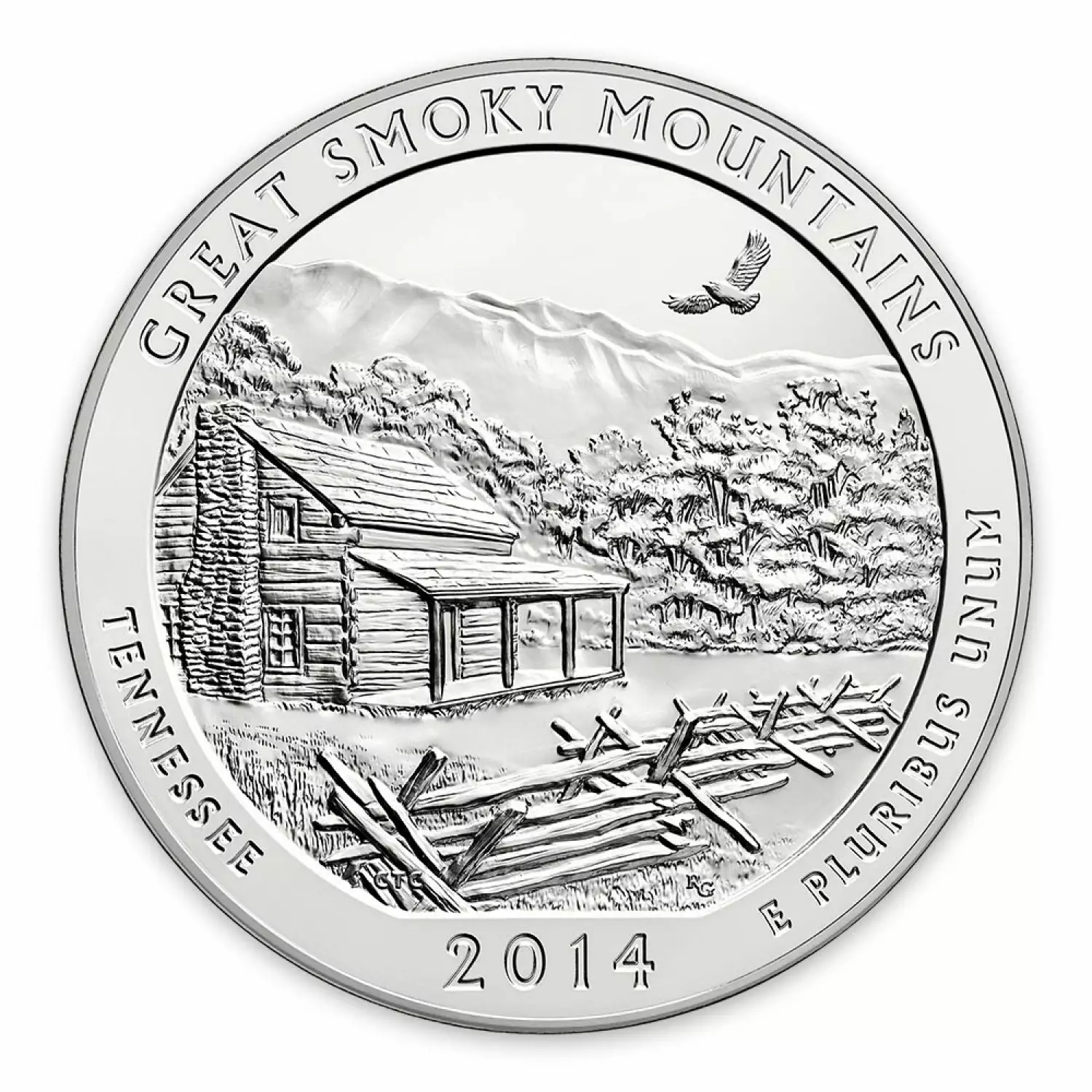 Since 2010, the US Mint released five silver America the Beautiful coins annually. The 5oz silver coins will be complete in 2021, each representing a historical monument or a treasured national park. These bullion coins were introduced following the success of the state quarter program.Great Smoky Mountains National Park is an American national park and a UNESCO World Heritage Site that straddles the ridgeline of the Great Smoky Mountains, part of the Blue Ridge Mountains, which are a division of the larger Appalachian Mountain chain. The border between Tennessee and North Carolina runs northeast to southwest through the centerline of the park.