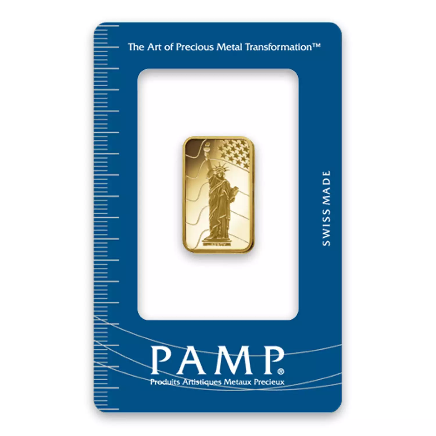 Each 10g PAMP Gold Bar - Liberty is composed of 10 grams of 9999 fine Gold. The obverse of the gold bar features the Statue of Liberty with the Stars and Stripes flowing behind her.