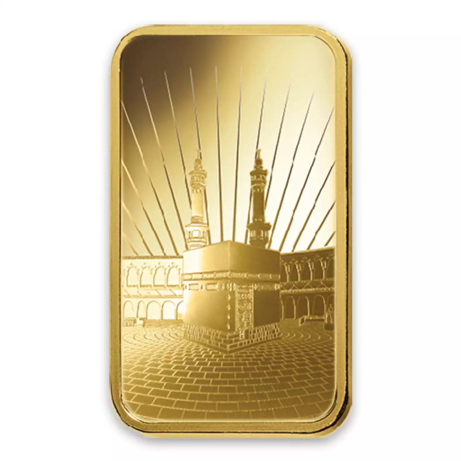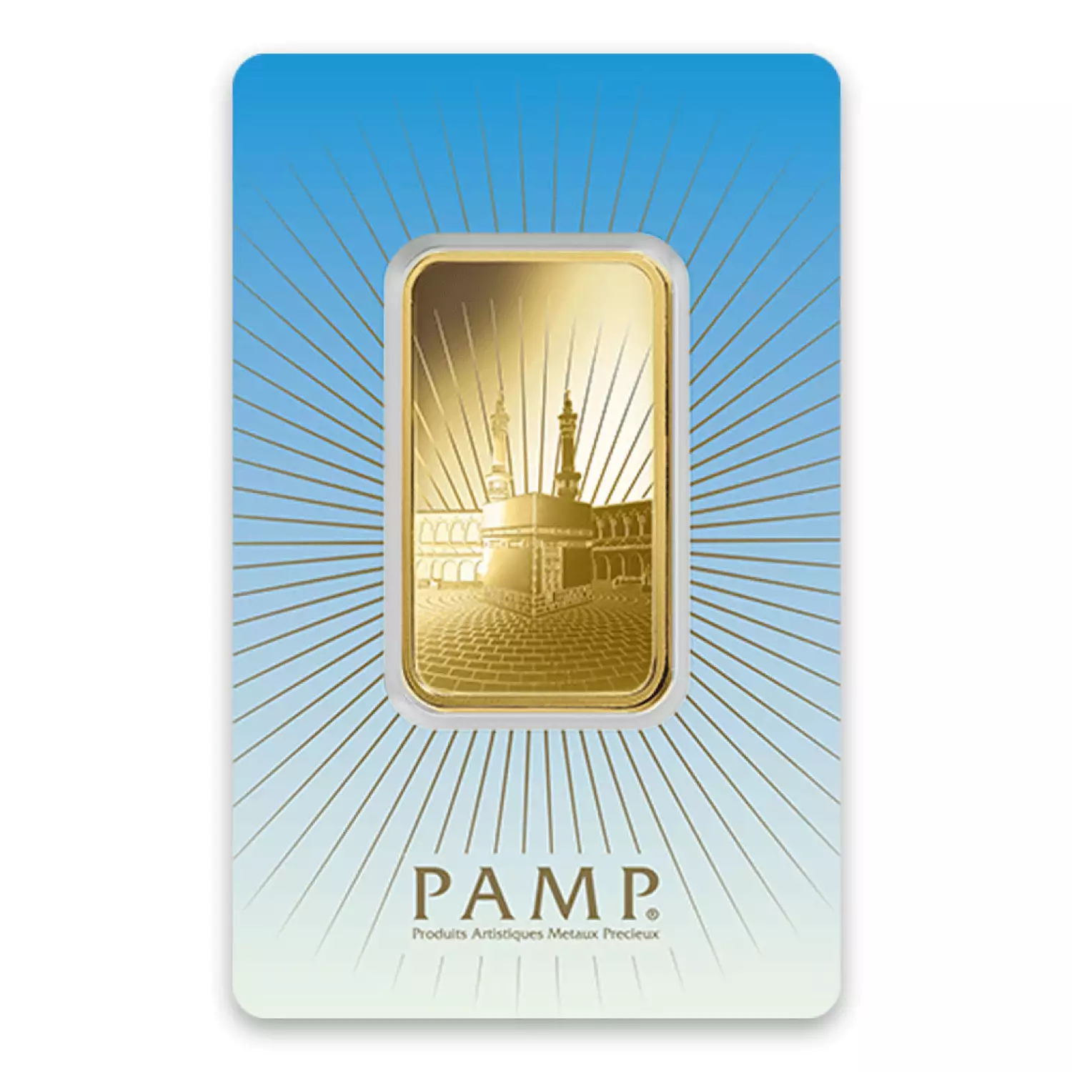 The 10g PAMP Gold Bar - Ka`Bah. Mecca features Mecca which is the holiest city in the religion of Islam. The Obverse of the 1 oz PAMP Gold Bar - Ka`Bah. Mecca depicts a depiction of the Ka`bahsmall shrine in Ka`bah, Mecca. The Reverse features the PAMP Suisse logo, weight and purity along with a unique serial number.