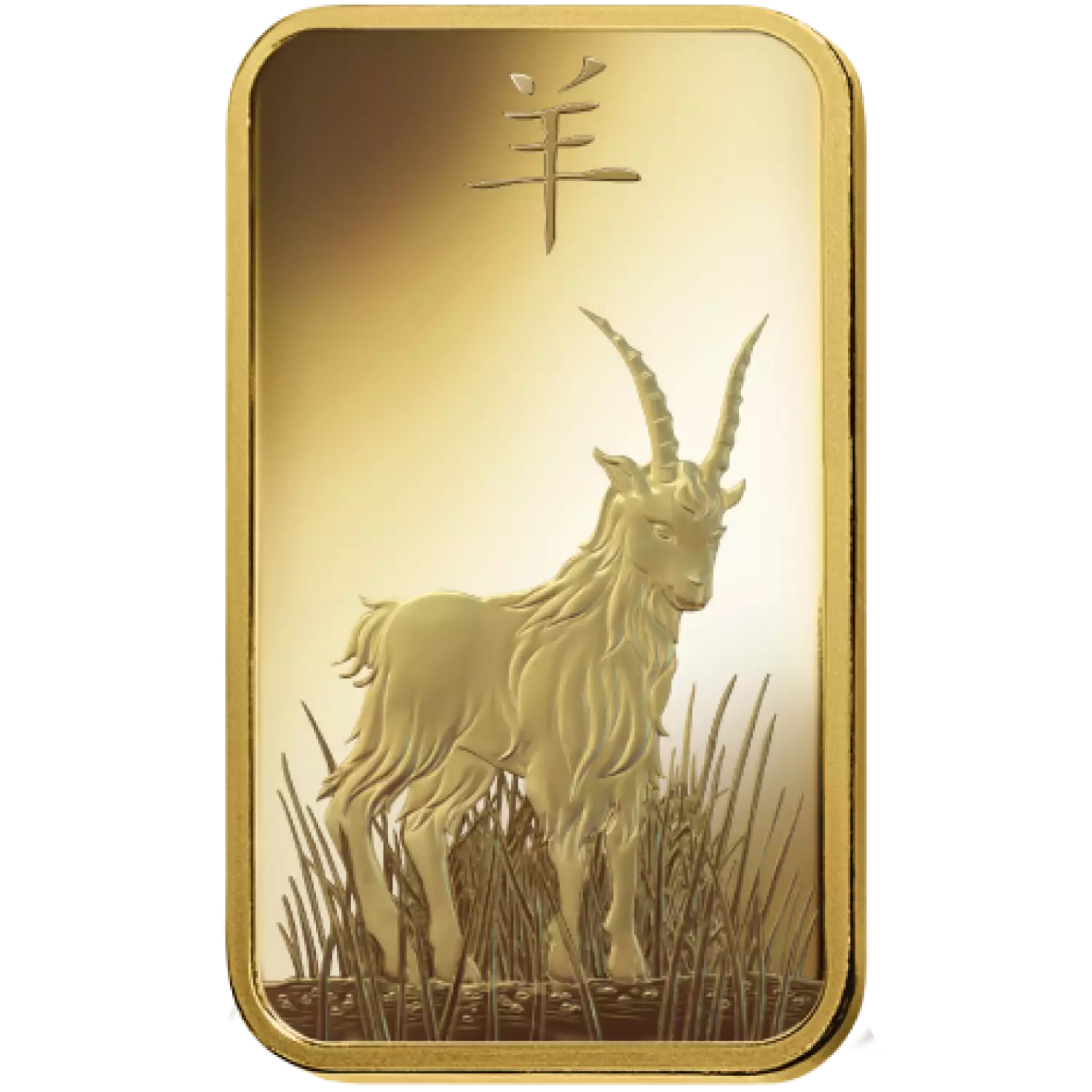 The 100g PAMP Gold Bar - Lunar Goat is manufactured in Switzerland and is composed of 100 grams of .9999 pure gold. This beautiful gold bar features a goat design for the Chinese Zodiac series on the obverse.