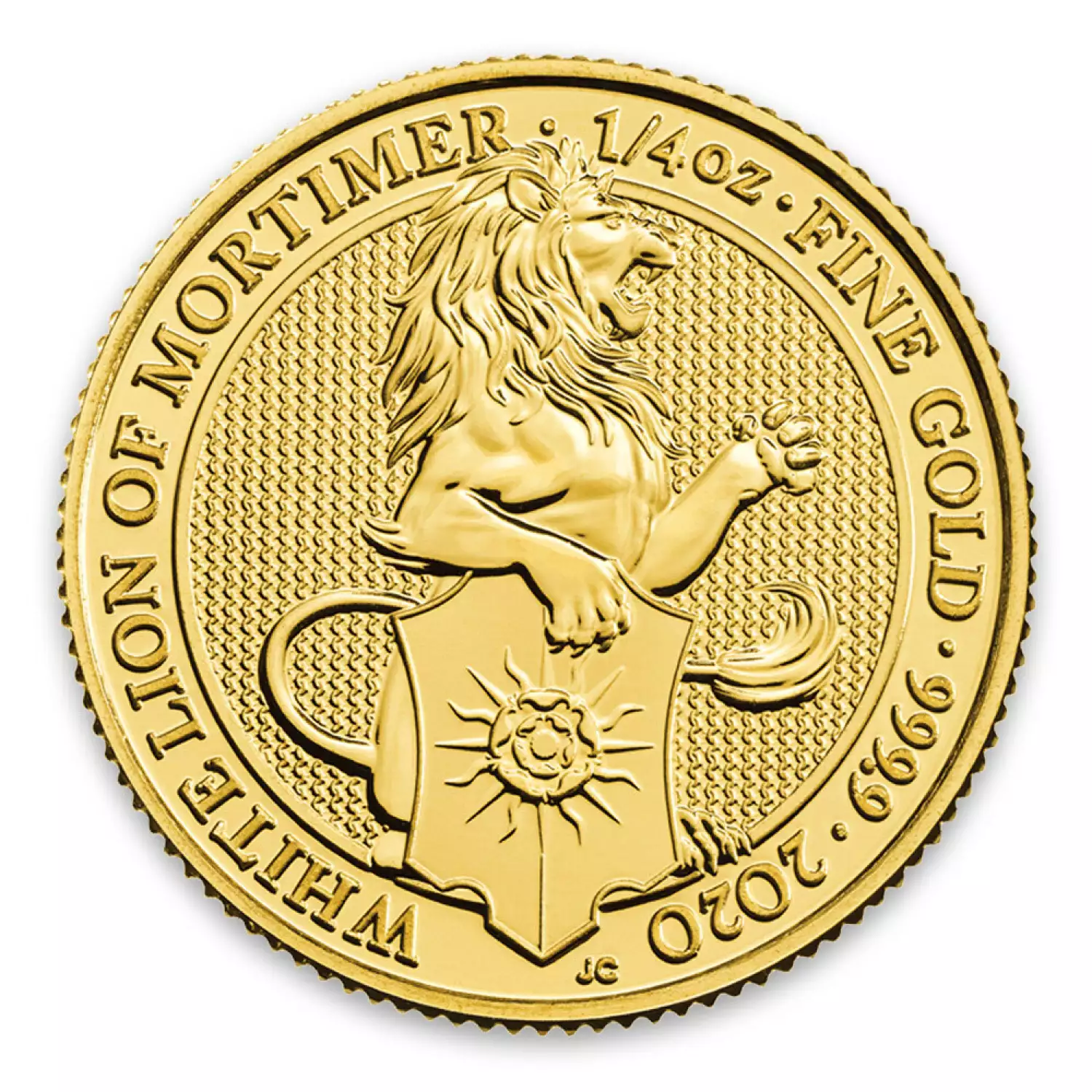 The 1/4oz 2020 Britain Queen's Beasts: The White Lion of Mortimer is the first release in an exciting new 10 coin series. The Britain Queen's Beasts celebrate the British Monarch and the centuries of fascinating heraldry. This gold coin contains 1/4 oz of .9999 fine Gold. The reverse, designed by Jody Clark, depicts a lion holding a shield with a rose on it, the symbol of York, along with the sun rays which symbolised good luck in the battles.