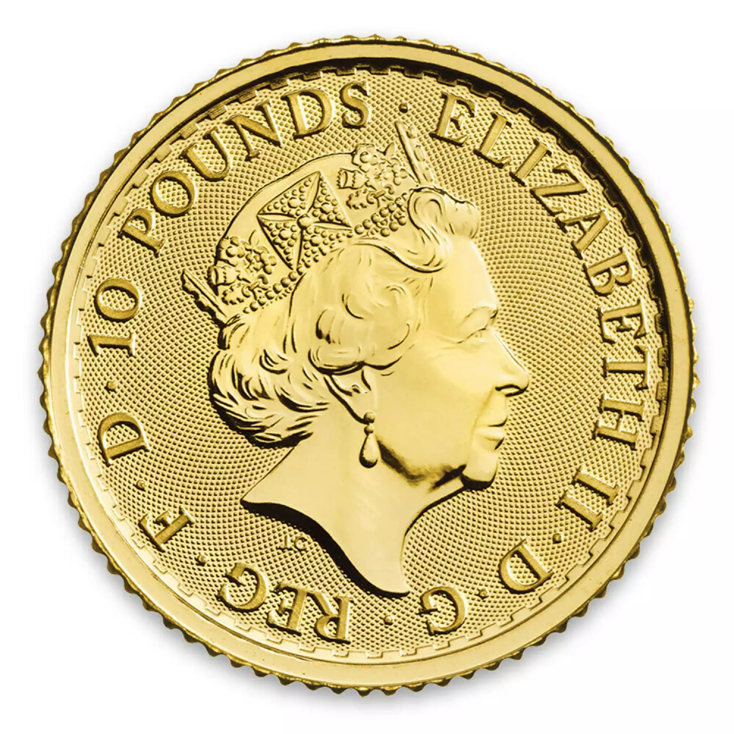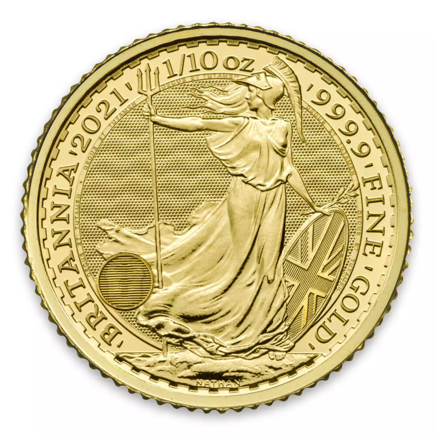 The British Gold Britannia continues to provide beauty and reliability. The 2021 1/10oz British Gold Britannia is one of the most popular investment coins in the world. Each 2021 1/10oz British Gold Britannia contains 0.1 troy ounce of .9999 fine gold. The reverse, designed by Philip Nathan has never changed since the first Britannia bullion coin in 1987. The Britannia has been a symbol through out the history and it’s first appeareance on the Roman coins is dating back over 2000 years ago.