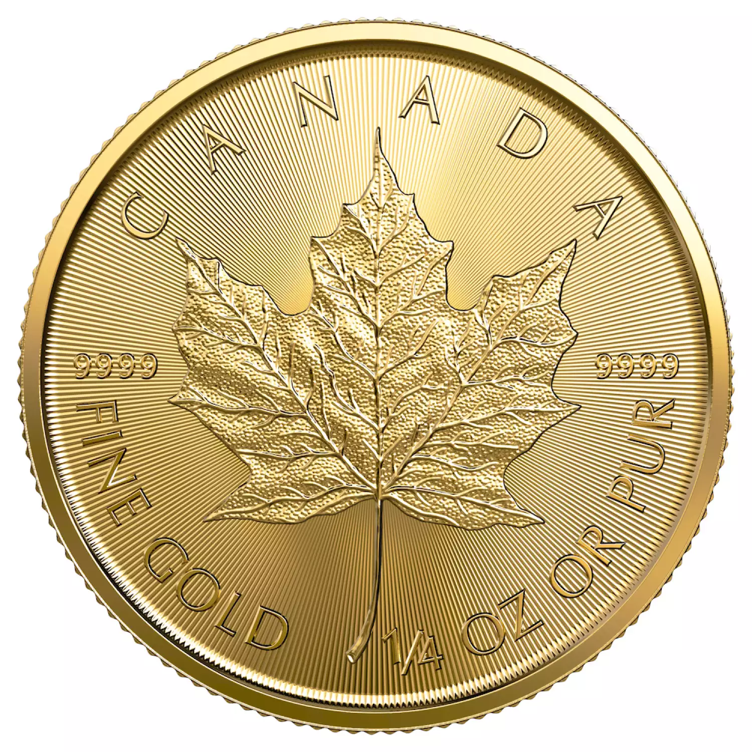 The 2021 1/4 oz Canadian Gold Maple Leaf coin contains 1/4 oz of .9999 fine Gold. The weight and purity of this coin is guaranteed by the Royal Canadian Mint. These 2021 maple leaf gold coins are highly popular among investors and collectors.