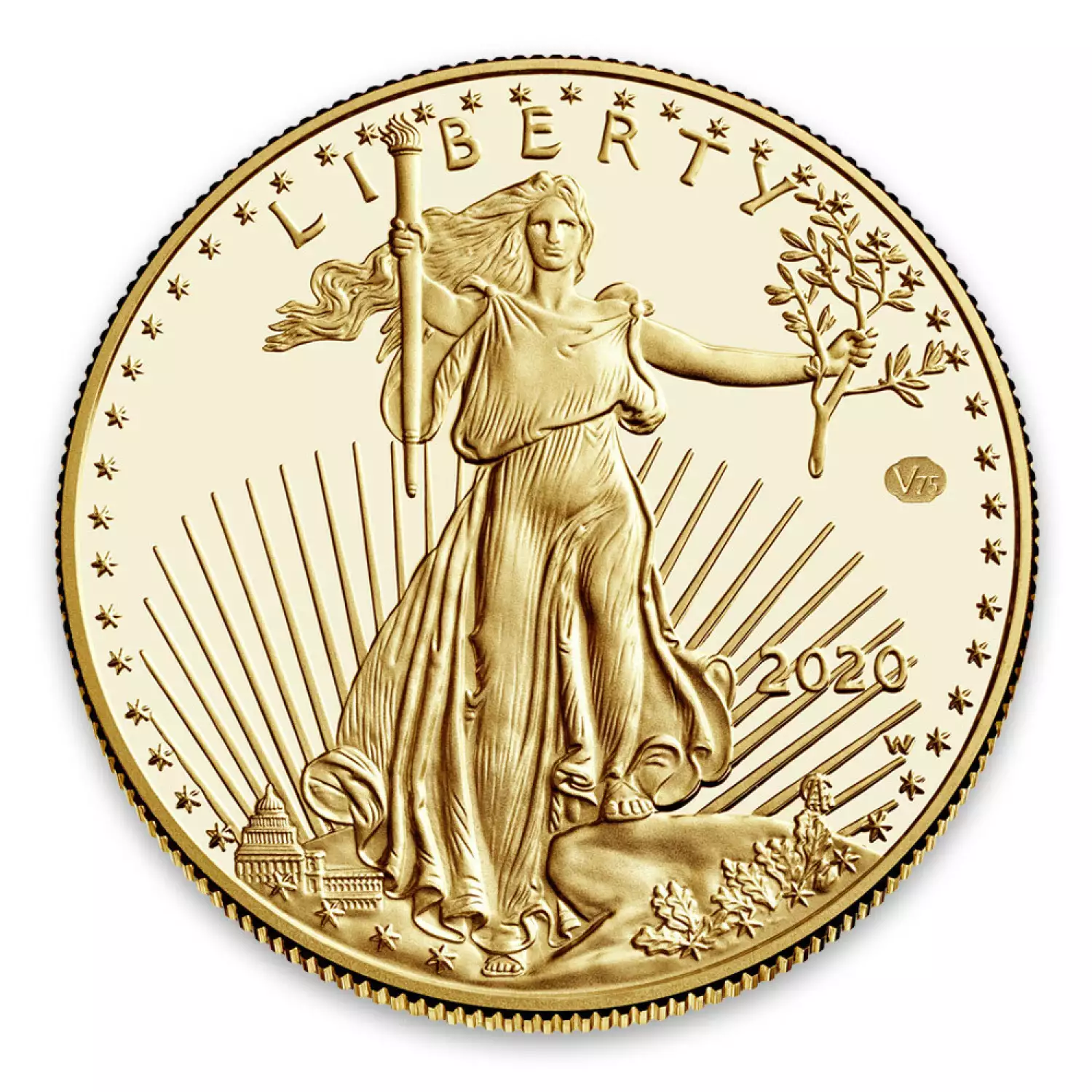 The obverse features a version of Augustus Saint-Gaudens’ full-length figure of Liberty with flowing hair, holding a torch in her right hand and an olive branch in her left. The reverse (tails) features a male eagle carrying an olive branch flying above a nest containing a female eagle and eaglets. The 22-karat gold coin is struck in West Point and bears the “W” mint mark. The coin is packaged in a burgundy velvet, satin-lined presentation case.
