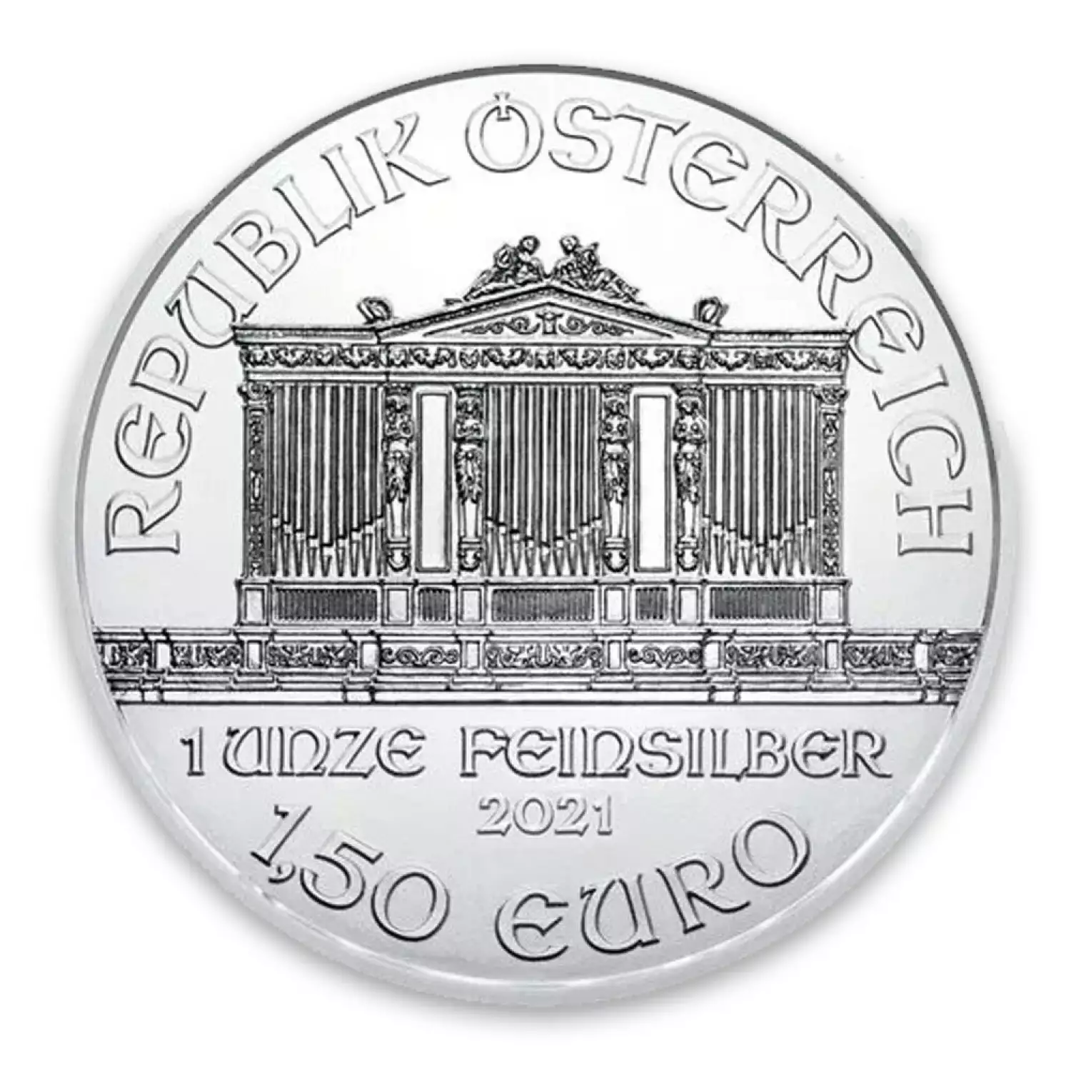 The Austrian Silver Vienna Philharmonic is a silver coin produced by the Austrian Mint. It is the most popular silver bullion coin in Europe. The coin is legal tender in Austria with a face value of 1.50 Euros. It weighs exactly 1 troy ounce of .999 fine silver. This Austrian Philharmonic silver coin has a beautiful design and is popular among all collectors and investors alike.