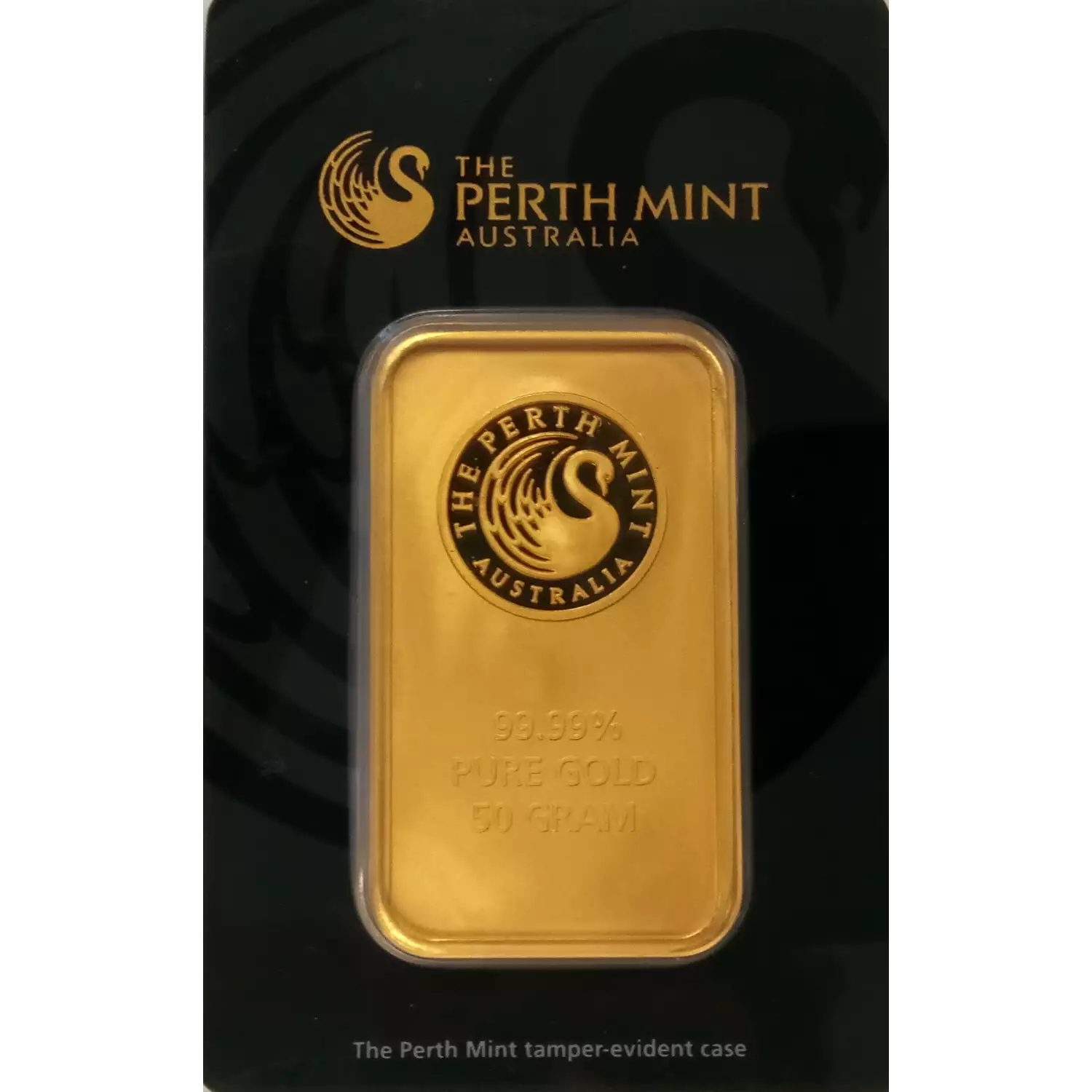 Each 50g Australian Perth Mint gold bar – minted contains 50 grams of .9999 fine gold.Each gold bar features the Perth Mint’s distinctive logo of a majestic swan along with weight and purity on the front. These gold bars are highly popular among investors and collectors for their high-quality.