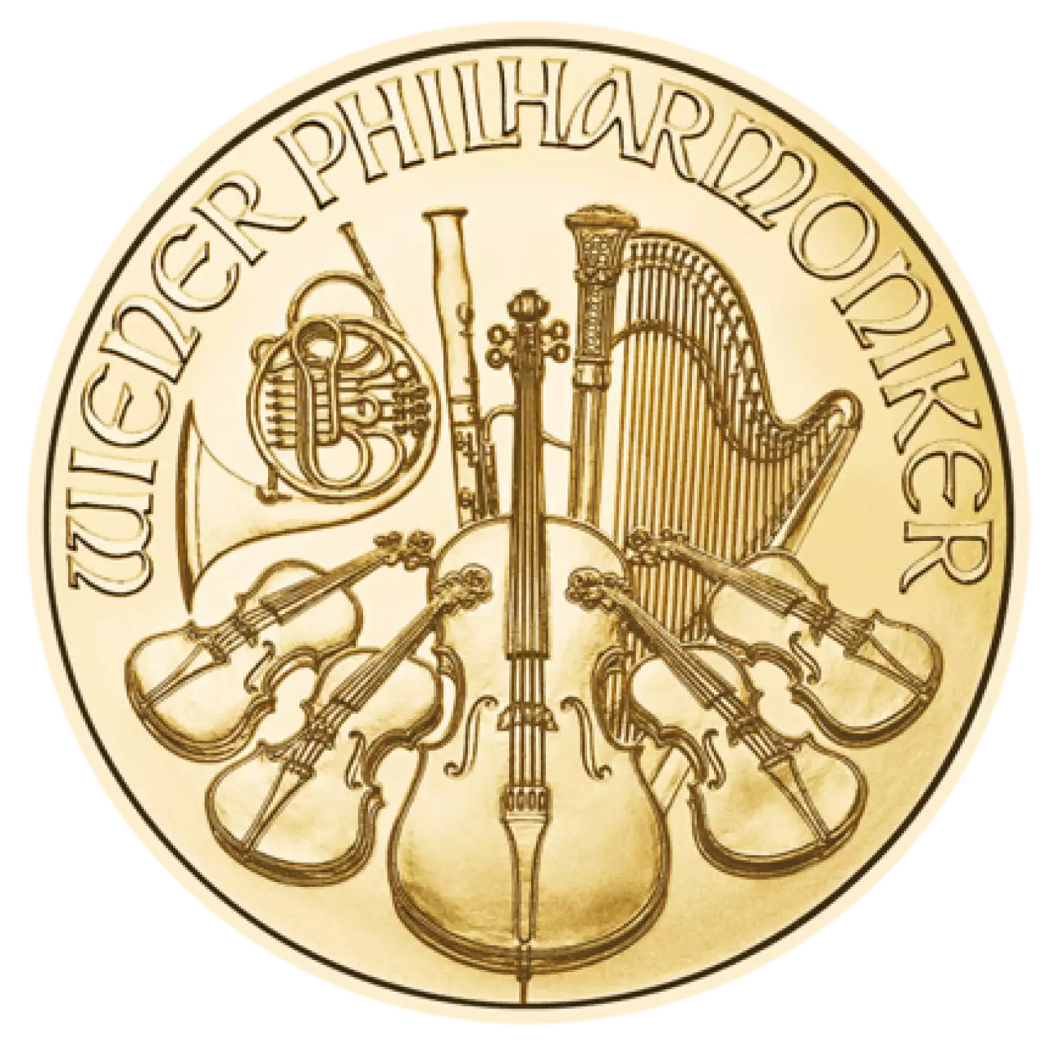 The Austrian Gold Philharmonic coins are manufactured as a tribute to the renowned Vienna Philharmonic Orchestra. This series of gold coin is highly popular among investors and collectors. The 2023 1 oz Austrian Gold Philharmonic coin contains 1 oz of gold. The Reverse of the coin features an array of instruments, including the cello, violin, harp, Vienna horn and bassoon.