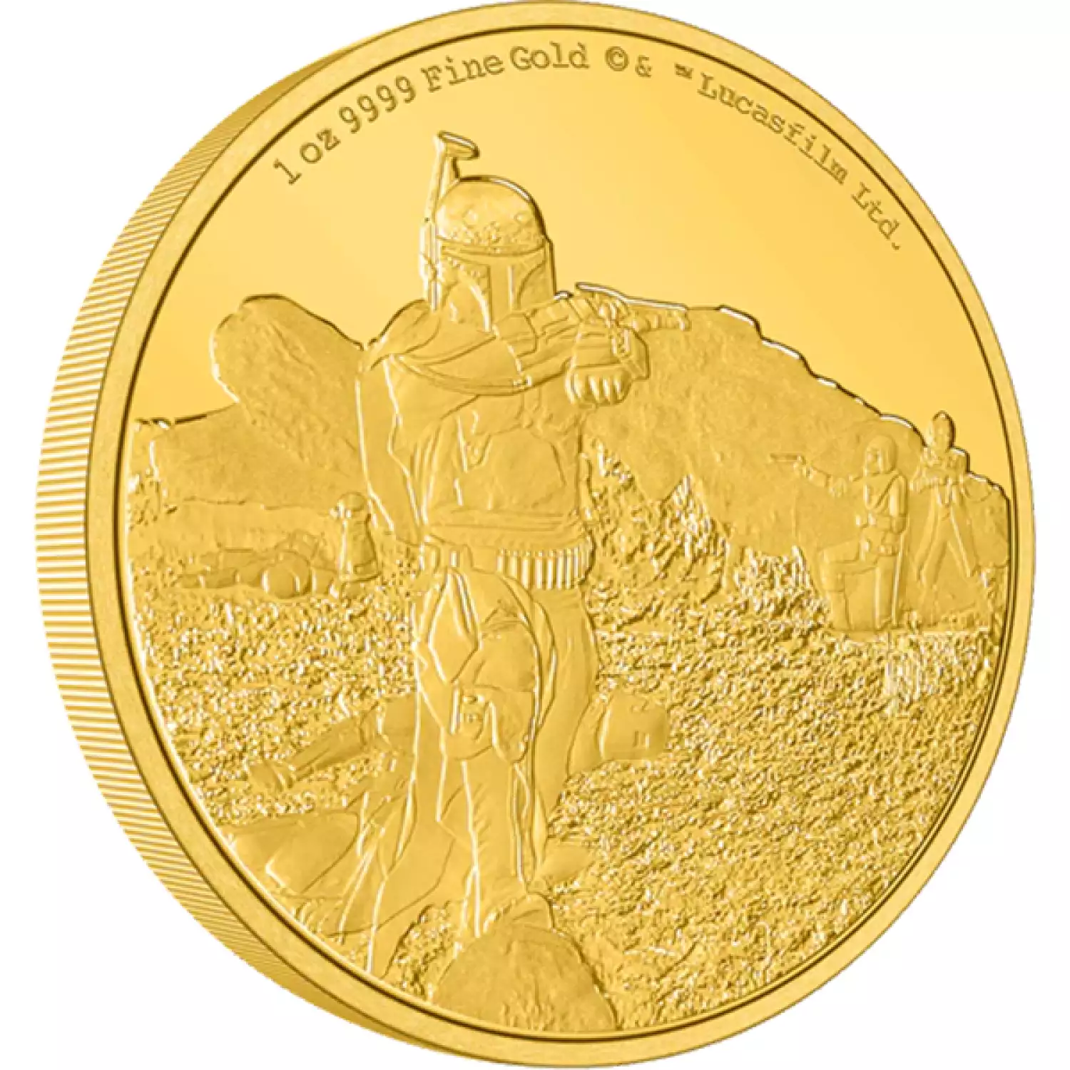This incredible 1oz gold coin features an intricately engraved image of Boba Fett™ in deadly battle, as seen in the Lucasfilm series The Mandalorian™. To further enrich the design, some relief, mirror-finish and frosting has also been added. Engraved on the obverse is the Ian Rank-Broadley effigy of Queen Elizabeth ll to confirm it as legal tender.