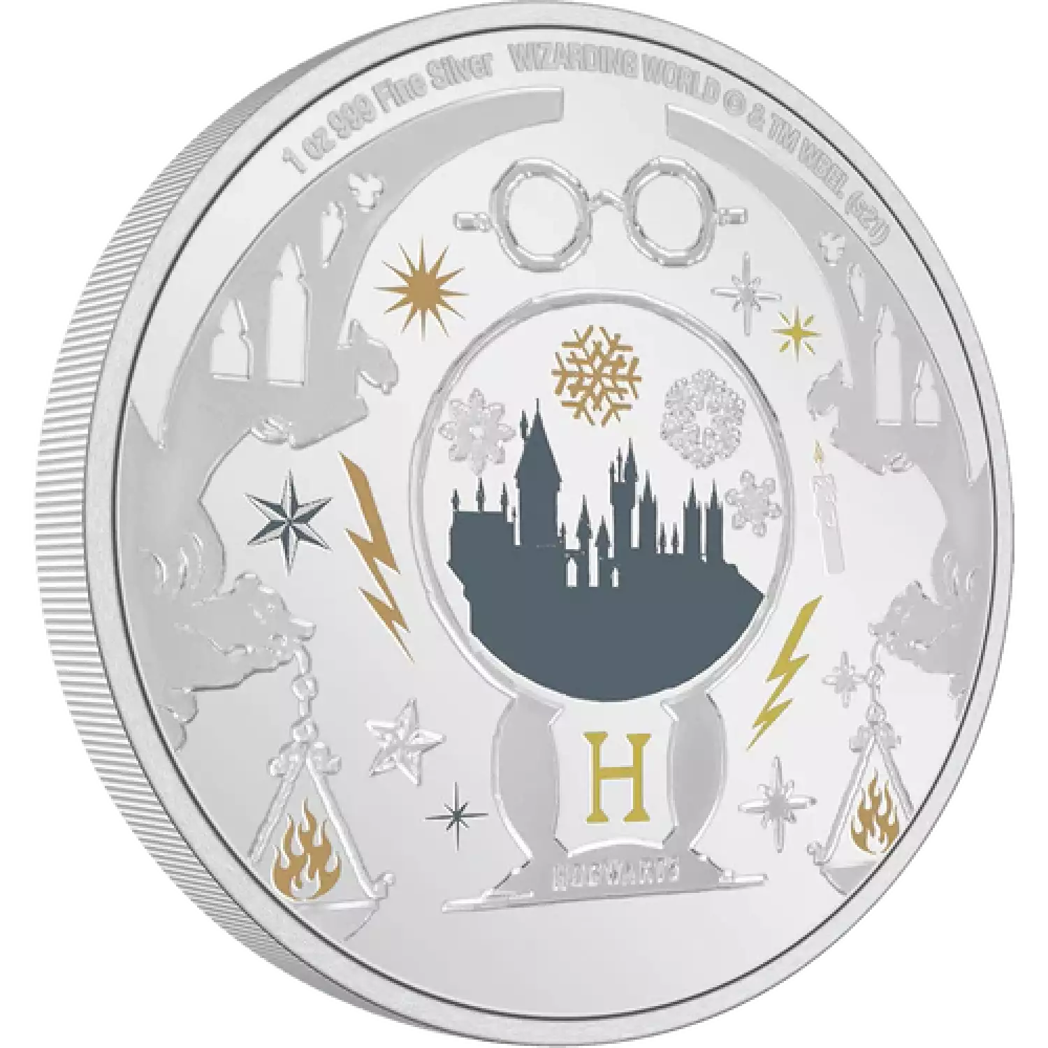 Our 2021 HARRY POTTER™ Season’s Greetings 1oz Silver Coin features HOGWARTS™ Castle surrounded by a montage of coloured and engraved icons synonymous with HARRY POTTER™. The mirror-like background shines beautifully - just like a pure silver coin should. The obverse features the Ian Rank Broadley effigy of Her Majesty Queen Elizabeth II to confirm it as legal tender.