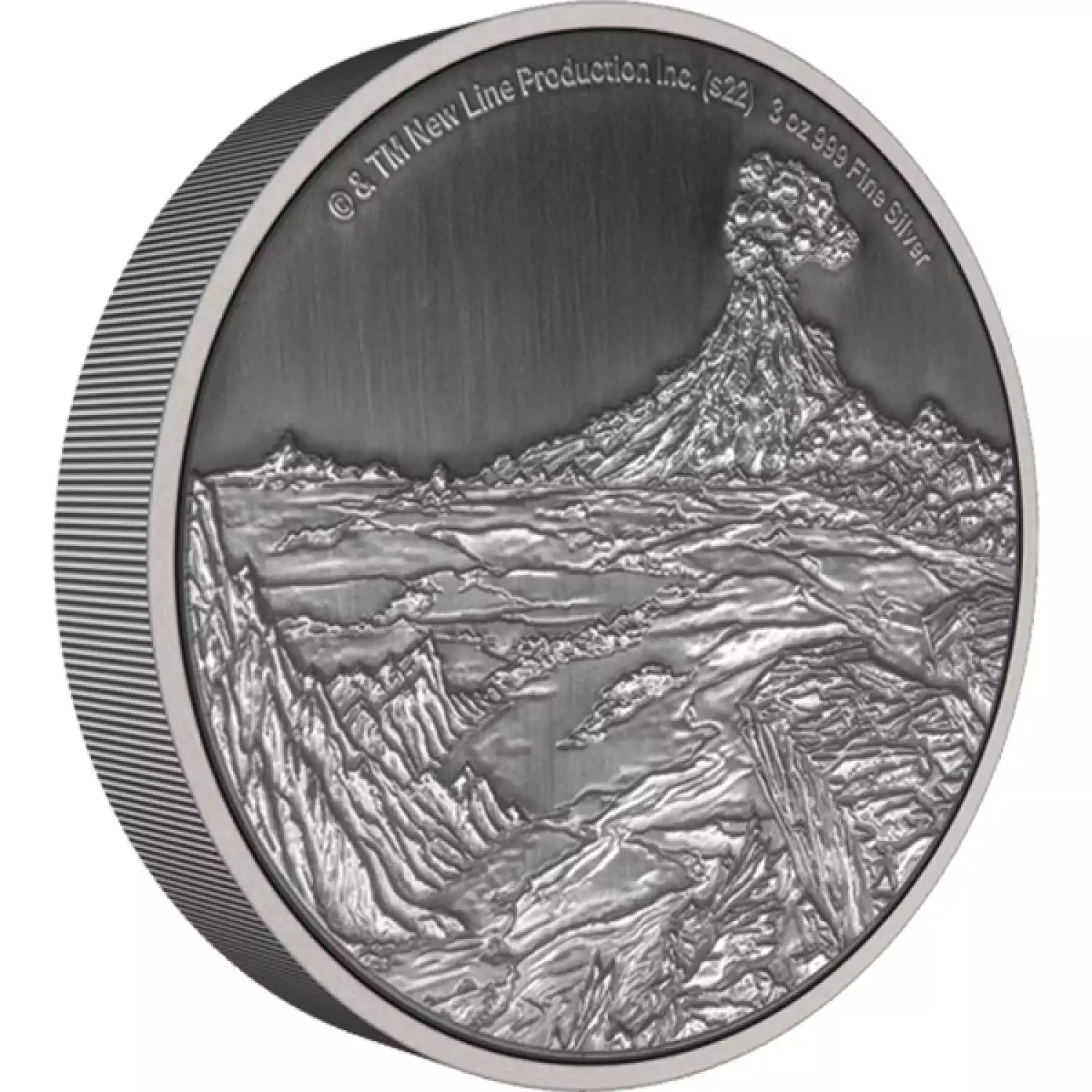 Made of 3oz pure silver, this coin shows the fiery volcano in Mordor, Mount Doom, from THE LORD OF THE RINGS™. It is fully engraved and antiqued with added relief for a truly epic design. The large 55mm diameter gives a wide view of this impressive landscape.