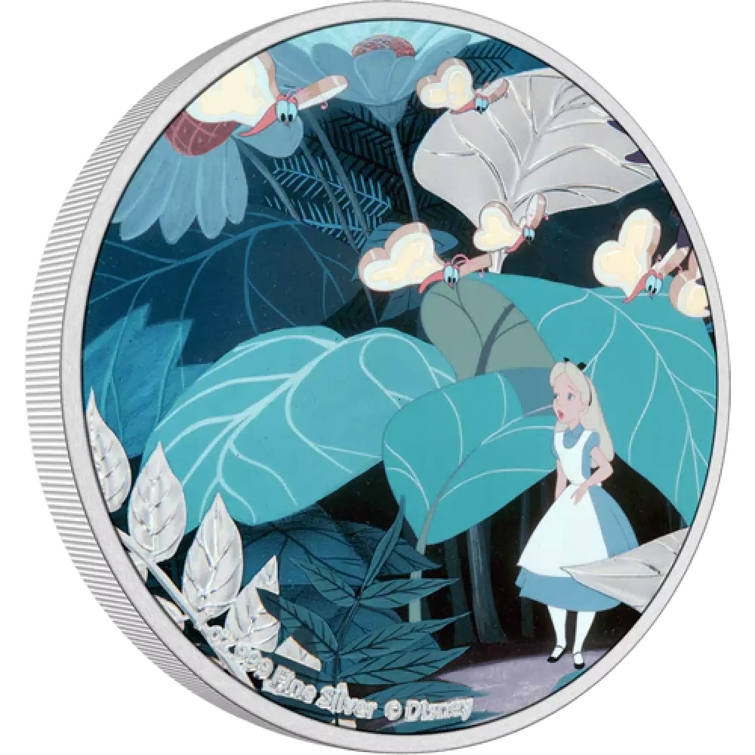 This whimsical 1oz pure silver coin celebrates the Disney movie Alice in Wonderland, 1951. The coin features a coloured image from the peculiar world of Wonderland, it shows a shrunken Alice walking amongst the Bread-and-Butterflies. The design also incorporates beautifully engraved leaves, using both a frost and mirror finish.