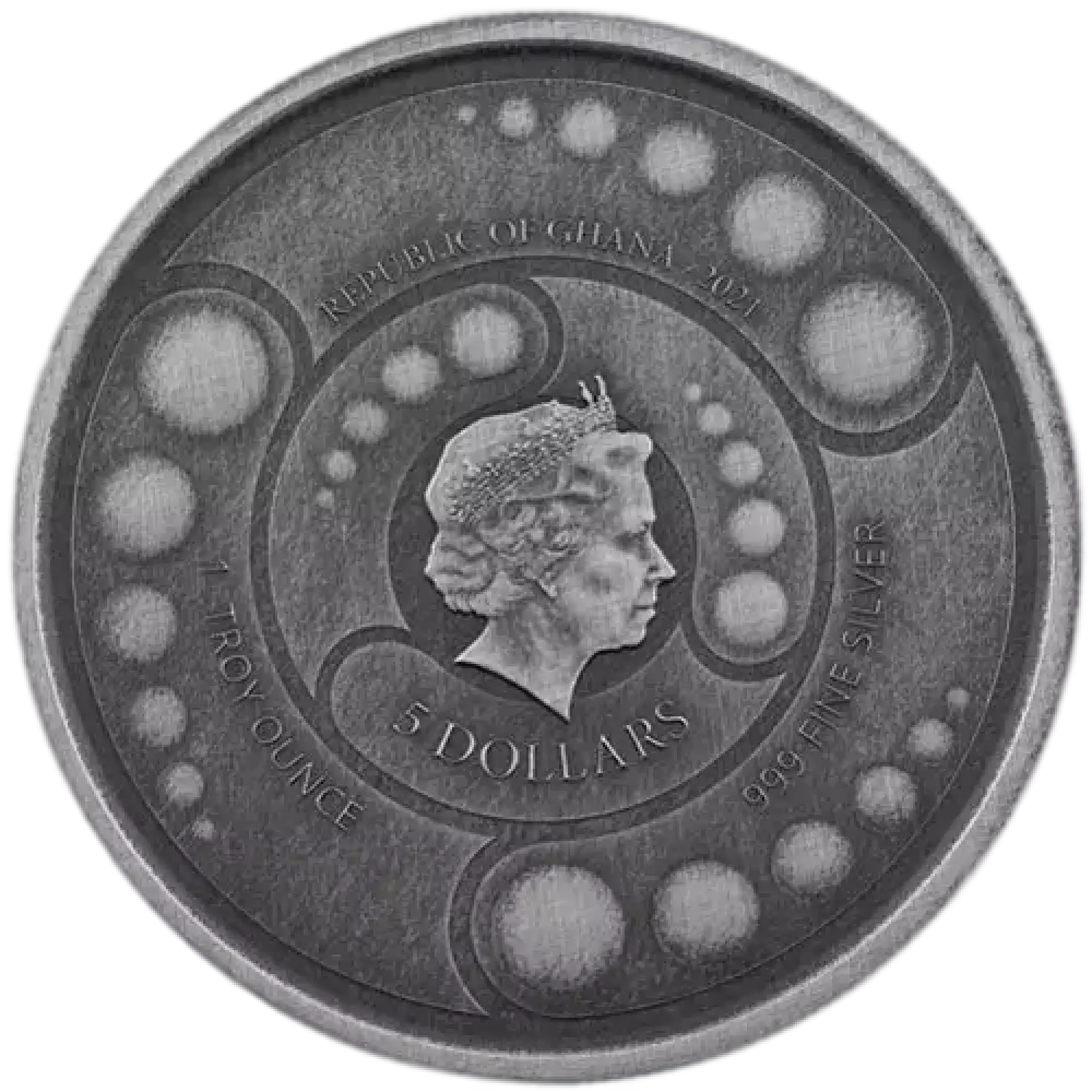 2021 1 oz Republic of Ghana Antiqued Silver 5 Dollar Space Alien BU Coin