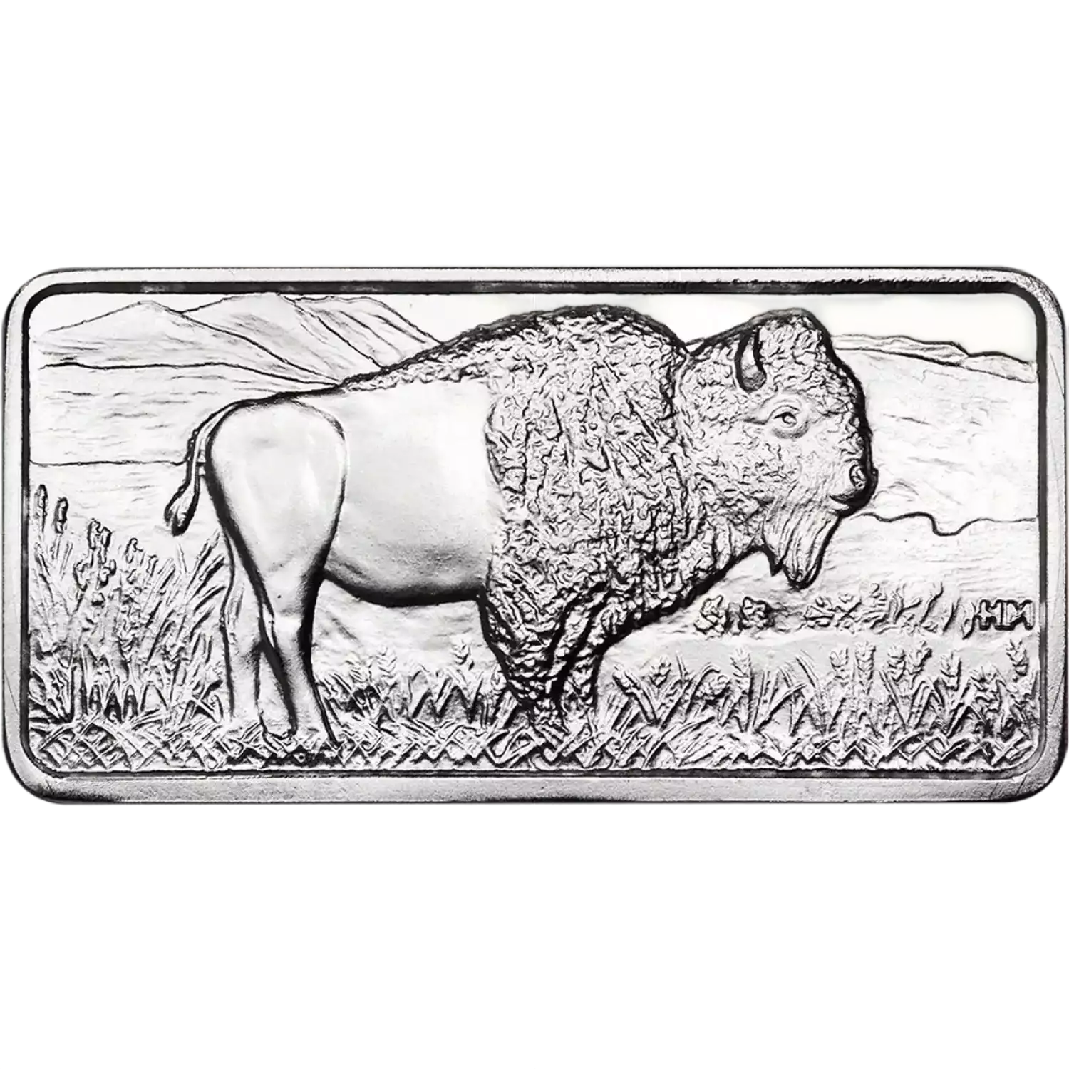 Produced by Highland Mint, one of the most trusted private mints in the U.S. This Buffalo 10 oz Silver Bar displays in horizontal format, a remarkably fine, detailed scene that fills the entire bar. Featured is a full, right-facing profile of an American Bison (buffalo) standing in the foreground of its native grazing lands in the American plains. It is surrounded by the grasses it is feeding upon, and the background shows the rolling hills and skyline. The HM mint mark is displayed at the right rim.