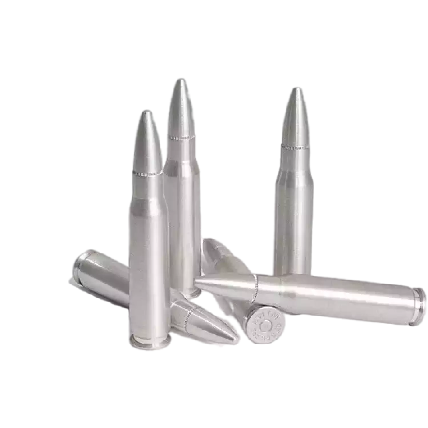 Molded exactly like the .308 Winchester bullet, the 2 oz. .999 Pure Silver Bullet .308 weighs approximately 2 oz of .999 pure silver, with it labeled on the bottom of the bullet. This bullet is solid silver throughout and cannot be fired from a weapon. The 2 oz. .999 Pure Silver Bullet .308 (7.62 NATO) are sold strictly for their silver content for investment purposes.