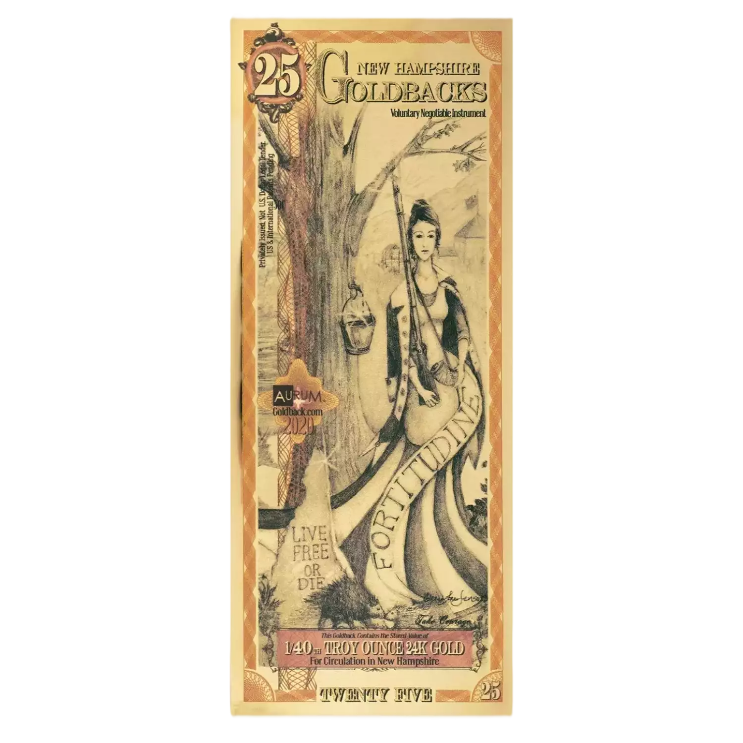 Fortitudine, or Fortitude, makes her second appearance in a Goldback series in New Hampshire’s 25 Goldback Denomination design. She is clothed in a military coat of a minute-man, and is wearing a dress that includes the vertical red and white stripes that were used by the early rebel colonists, which were ultimately included horizontally in the United States flag. She is leaning a musket over one shoulder and has a powder horn in the opposite hand, both understood as being captured from Fort William and Mary as illustrated in the 10 Goldback Design. Next to her stands a miniature depiction of New Hampshire’s famous granite monument featuring the state’s motto: "Live Free or Die", and the caption beneath her reads "Take Courage".