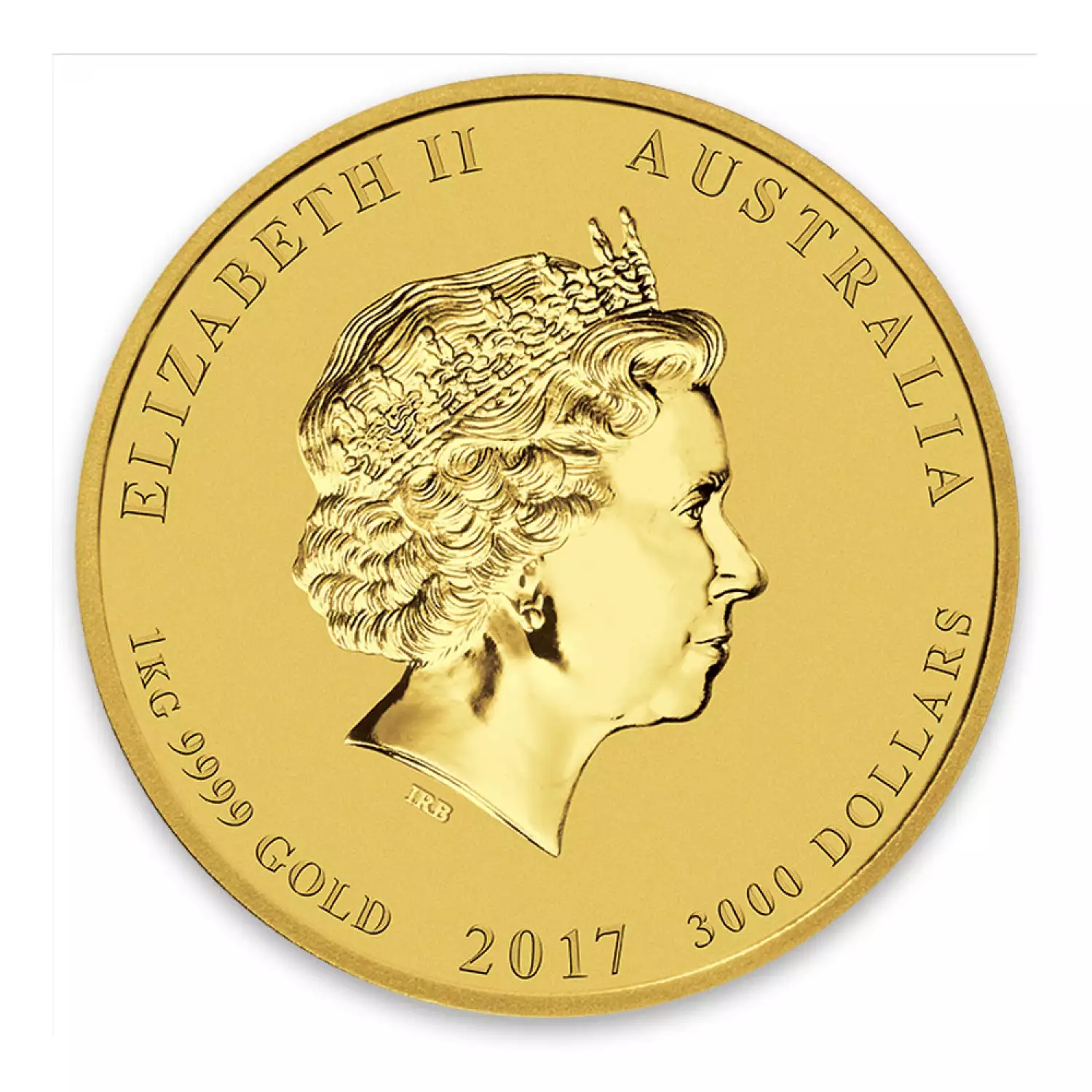 The 2017 1kg Australian Perth Mint Gold Lunar II: Year of the Rooster is composed of 1kg of .999 fine gold. This striking bullion coin is backed and guaranteed by the Federal Government of Australia for its weight and fineness. The Obverse features the Ian Rank-Broadley likeness of Her Majesty Queen Elizabeth II. The Reverse features a rooster standing in a stylized Chinese scene featuring bamboo and leaves in the field of the coin.
