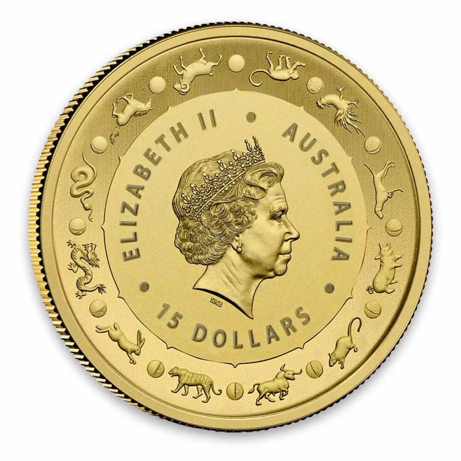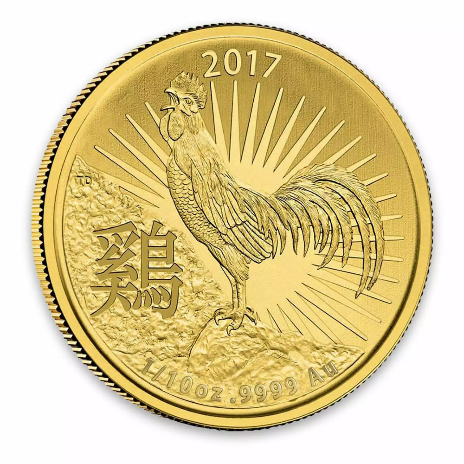 The Obverse of the coin features the Ian Rank-Broadley likeness of Her Majesty Queen Elizabeth II. The Reverse features a rooster calling out with the sun beaming behind it along with the Chinese character for "rooster" surrounded by the date, weight and purity.